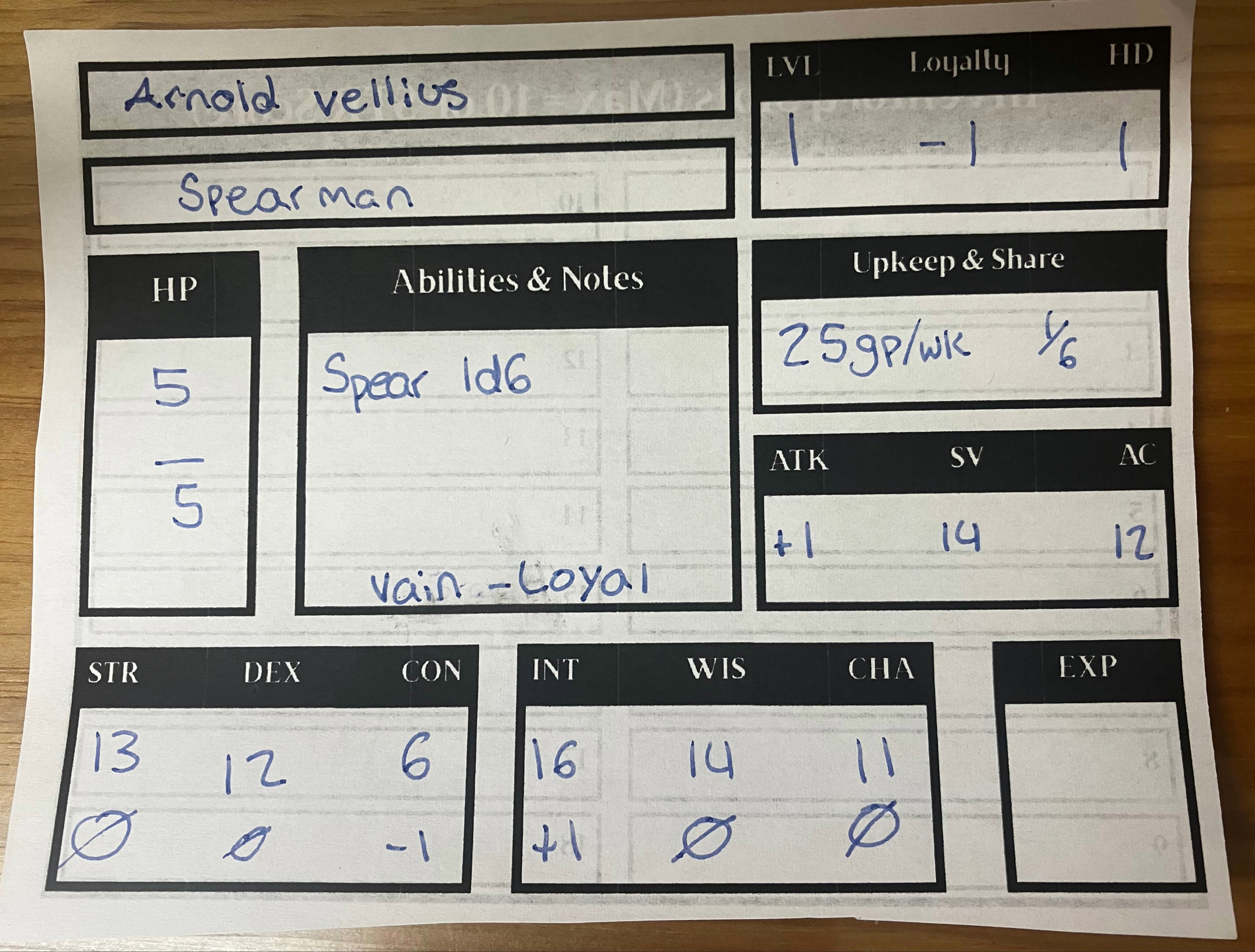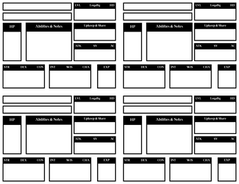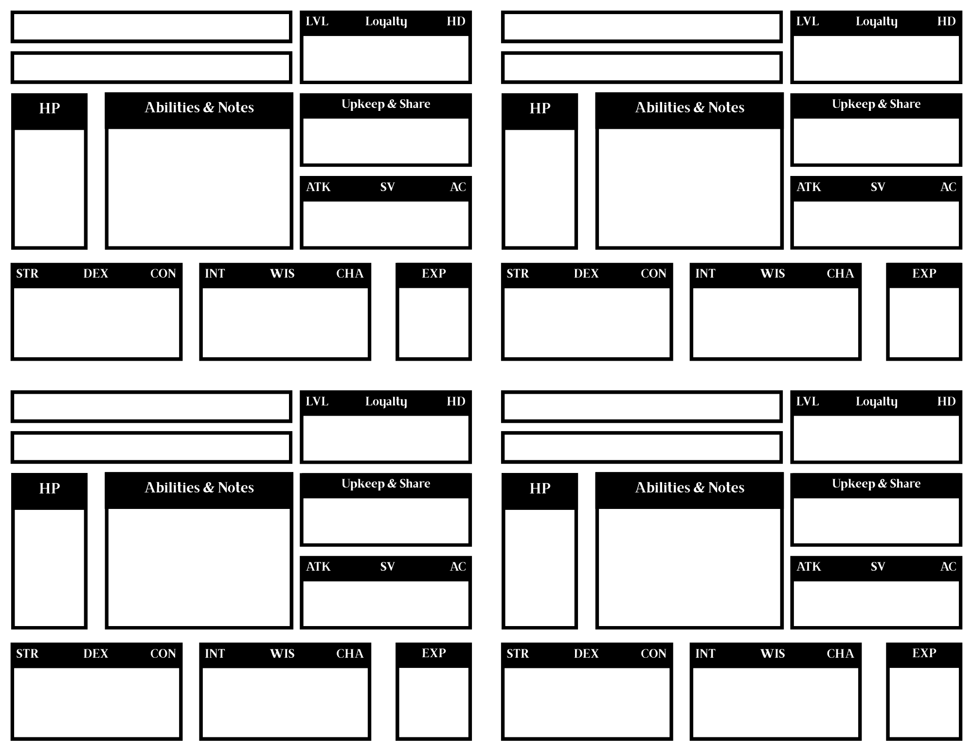 A simple sheet to track your character's hirelings/retainers. Designed to match my Character sheet booklet. Made into quarter sheets for ease of use.